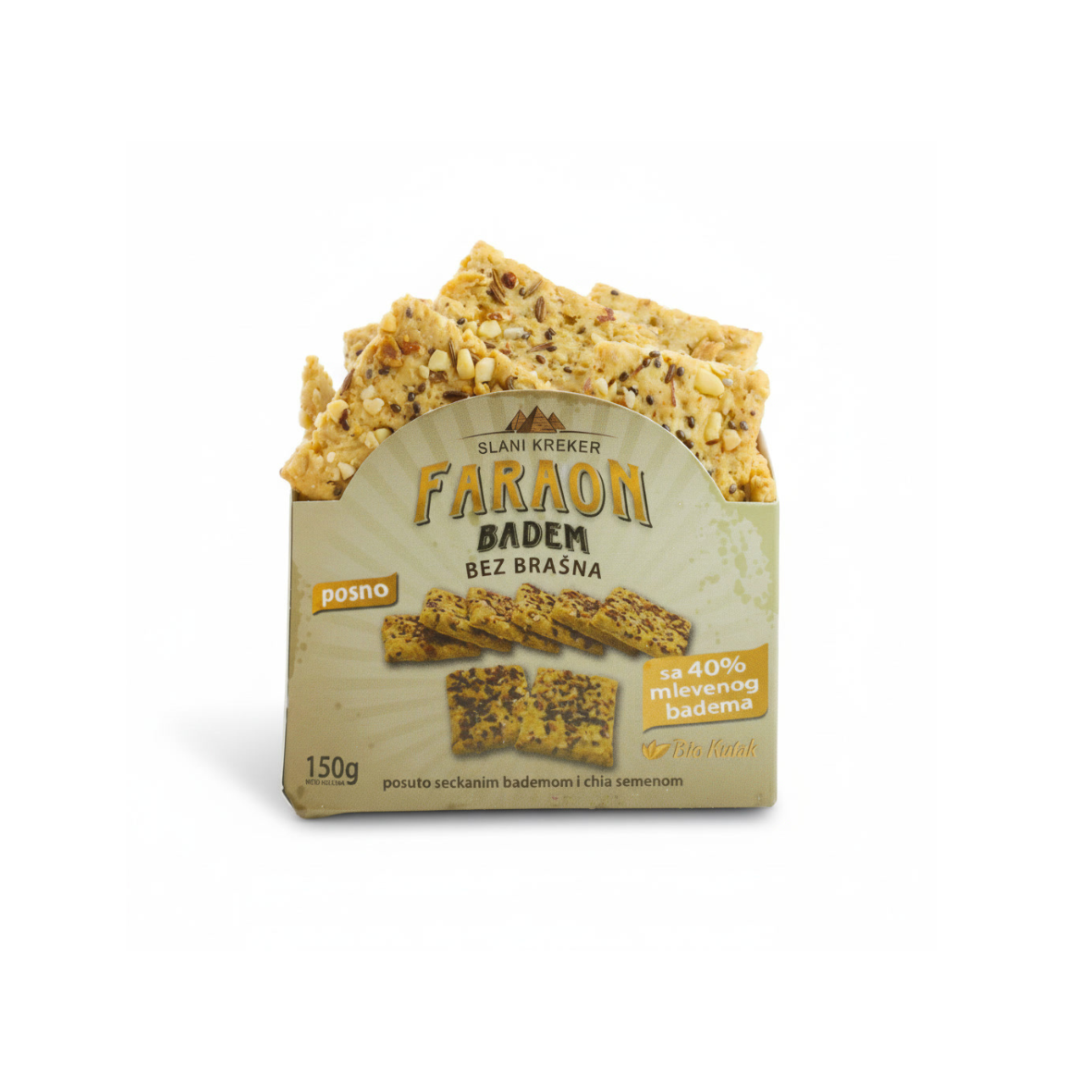 Hrskavi krekeri sa 40% badema u sastavu, veci deo je bademovo brasno a manji deo je lomljeni badem u posipu. Kombinacija mlevene leblebije, badema I kima daje krekeru divan orašast ukus