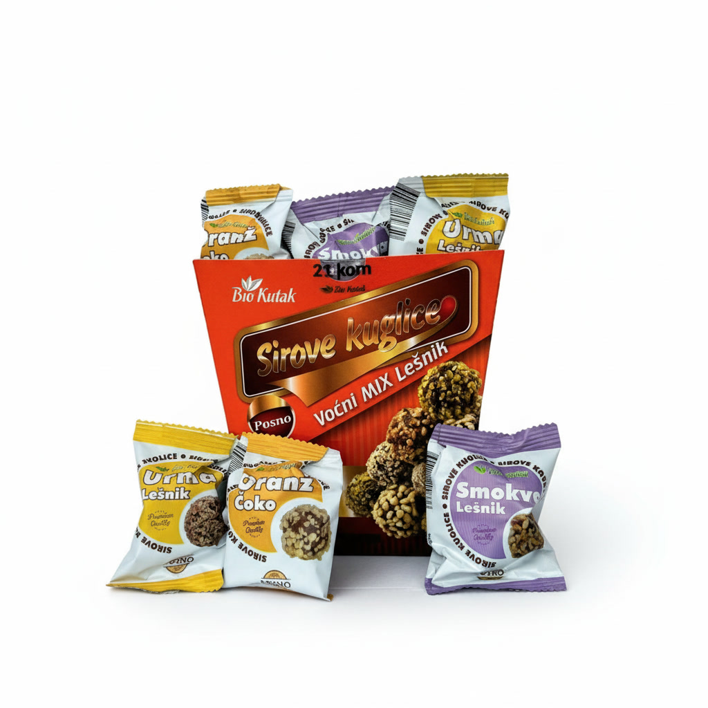 Mix od 3 vrste sirovih kuglica u pojedinačnom pakovanju od 30gr. 21kom ukupno.